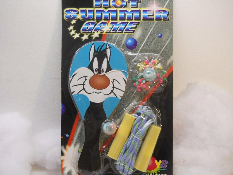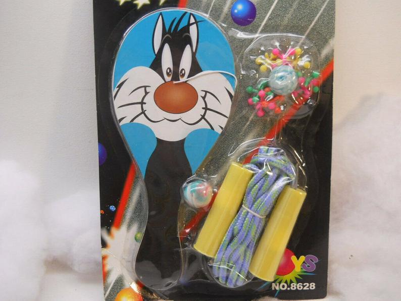 This is a kids toy set of 3 games, jump rope, balls and jacks and paddle ball with a cat, This set is for either boys or girls both like these games. The paddle ball set is a large wooden paddle and printed design. This is a real nice toy set.