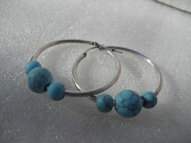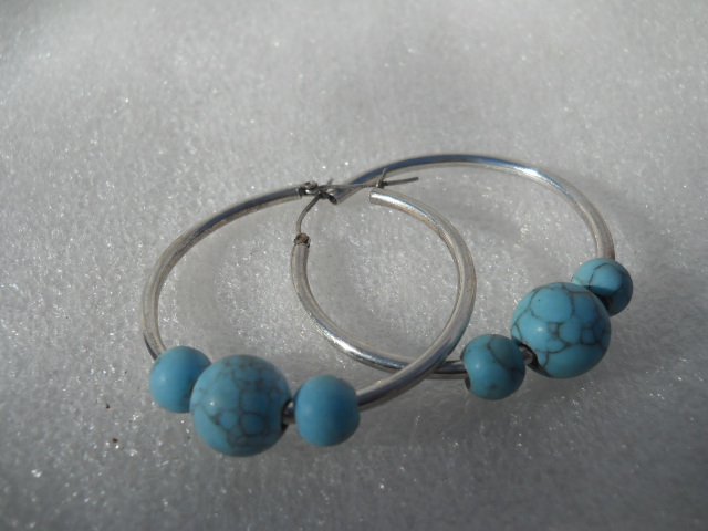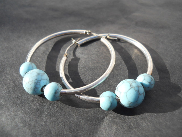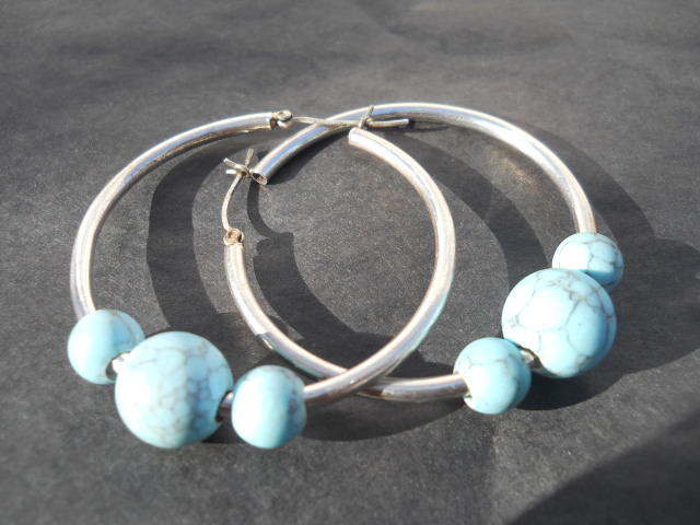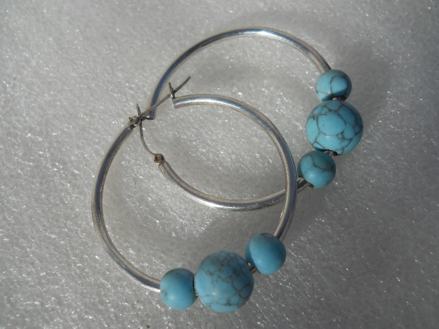 925 Solid Stamped Sterling Silver. These Large Turquoise Hoops measure about 2" x 2"D. Has 2 beads that are 10mm & 1 that is 12mm solid turquoise. stone beads. The hoops are about 6 mm round These are Surgical Steel posts. These are Beautiful Crafted Hoop Earrings.