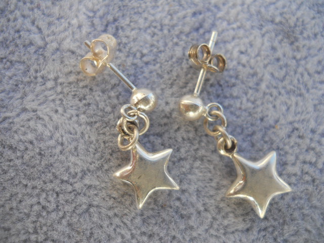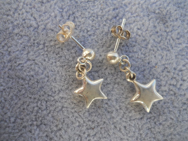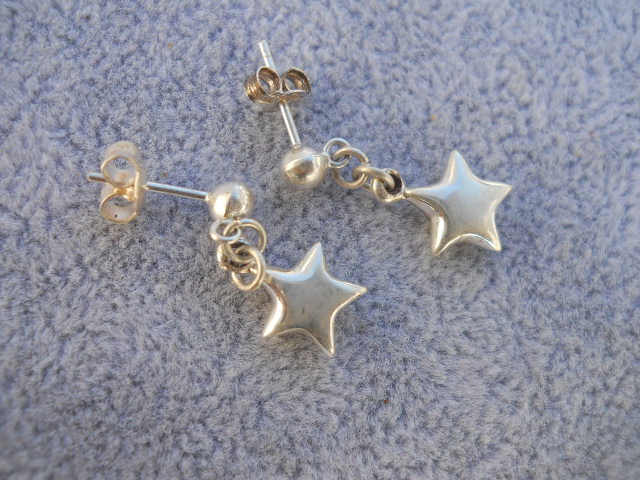 These beautiful Sterling silver Star earrings with ball studs are crafted 925. These Dangle earrings have a beautiful glossy silver natural shine. Stamped 925. Come with surgical steel posts. These measure 1.0 inch long x 0.25 across. The ball studs are 3mm. Gift Boxed.