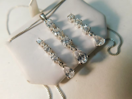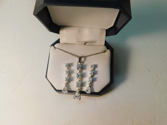 These fine 925 stamped necklace and earring comes with gift box. The earring and necklace have clear cz stones. Measure The earrings 1 1/2 inch long The Pendant is 1 1/2 long The 2mm box chain is 18 inch long.. This is signed RT also. Have very high shine finish. These are beautiful with nice design.