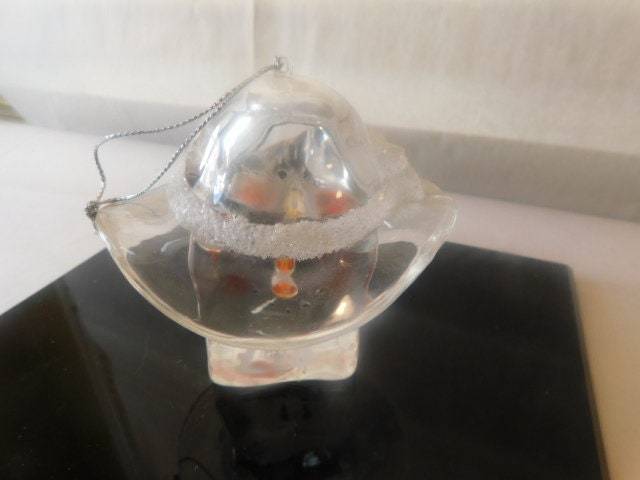 This is a beautiful carved crystal Snowman Ornament with Glitter glass, This measures about 3.5 inches x 3.0 inches Comes with silver tie, handed face, glitter on cap. This can be either hanged or sat on table. 2 styles per hat just like each other but the hat is different, see pics