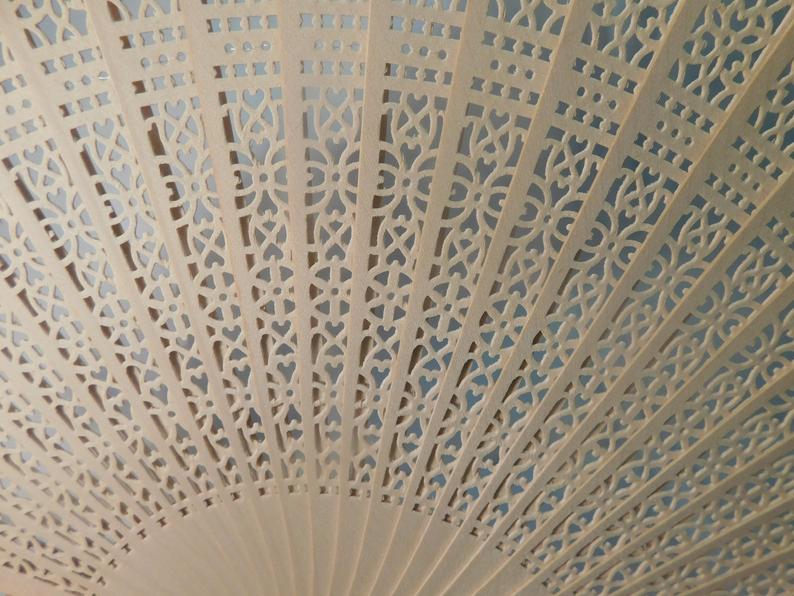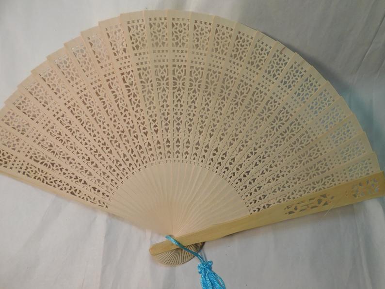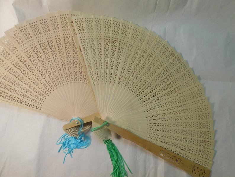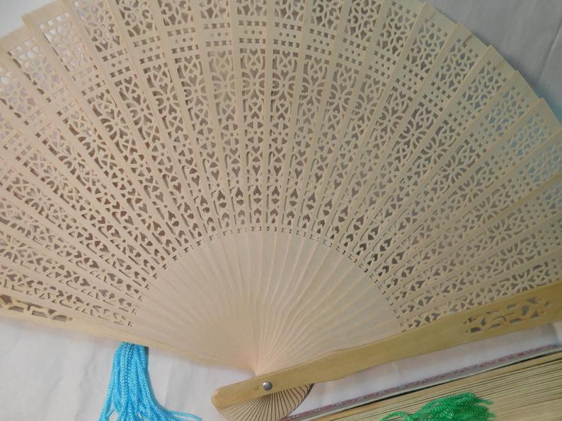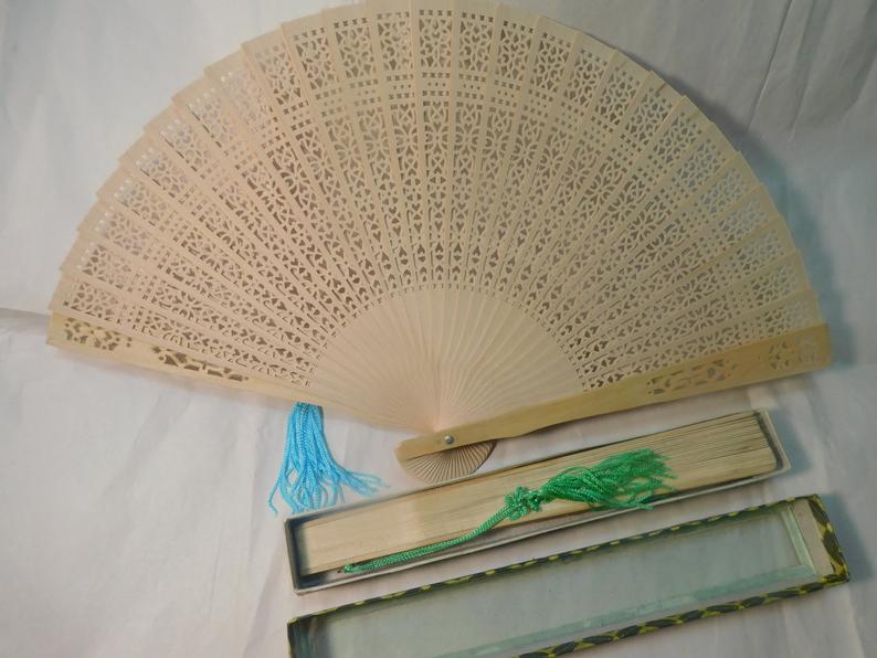 This Fan is hand carved in Bamboo wood and has a nice design within fan ribs.. A very nice quality style fan. It Measures 8 1/2 x14 1/2" when opened. Comes with hand made colorful tassel that comes in a various of colors. This fan comes in a glass cardboard box as shown. Fan is the same on both sides. The Fan gives good luck along with Oriental Culture.