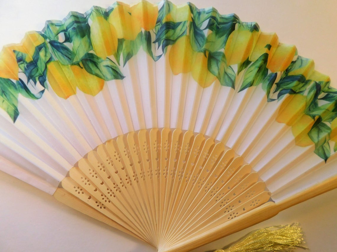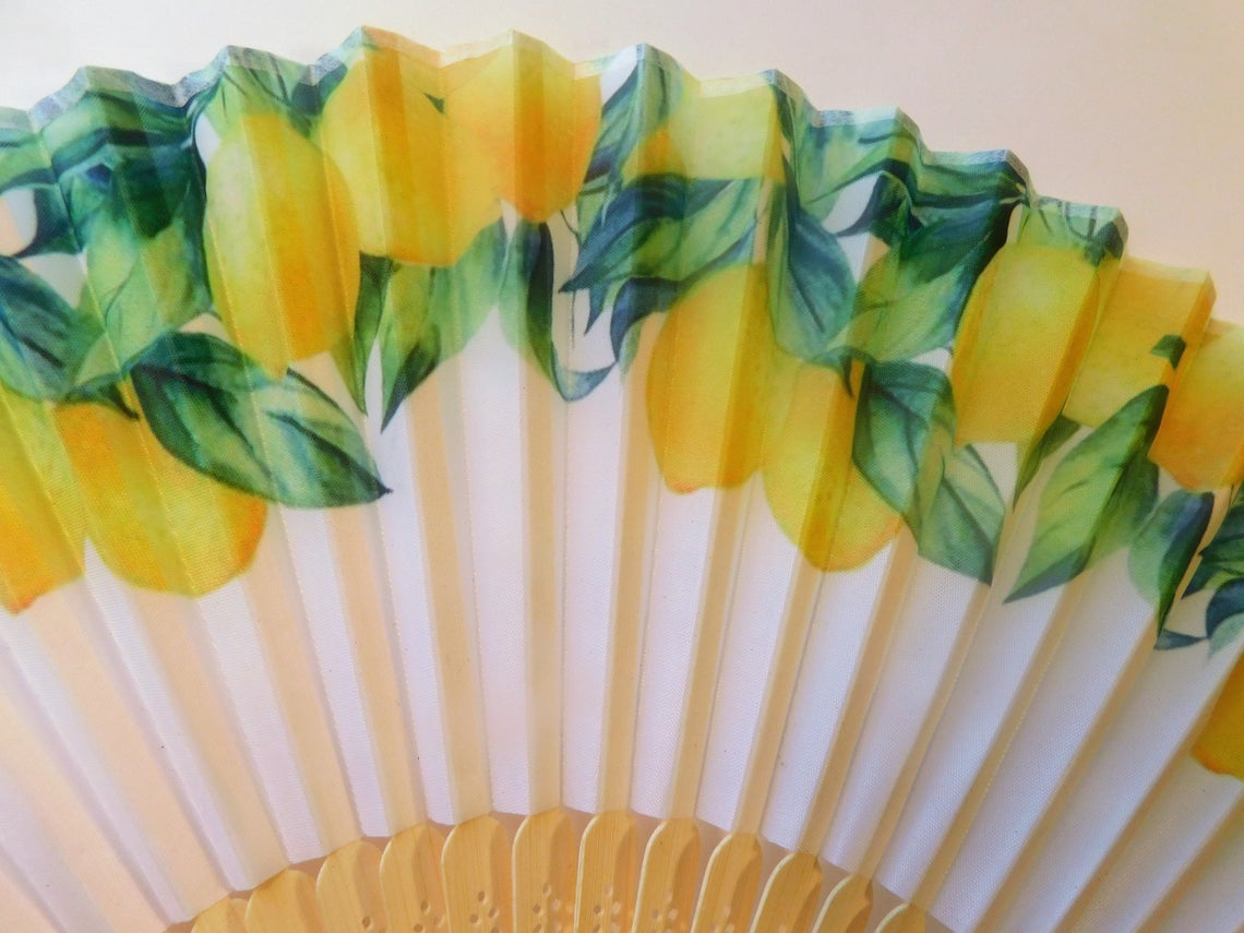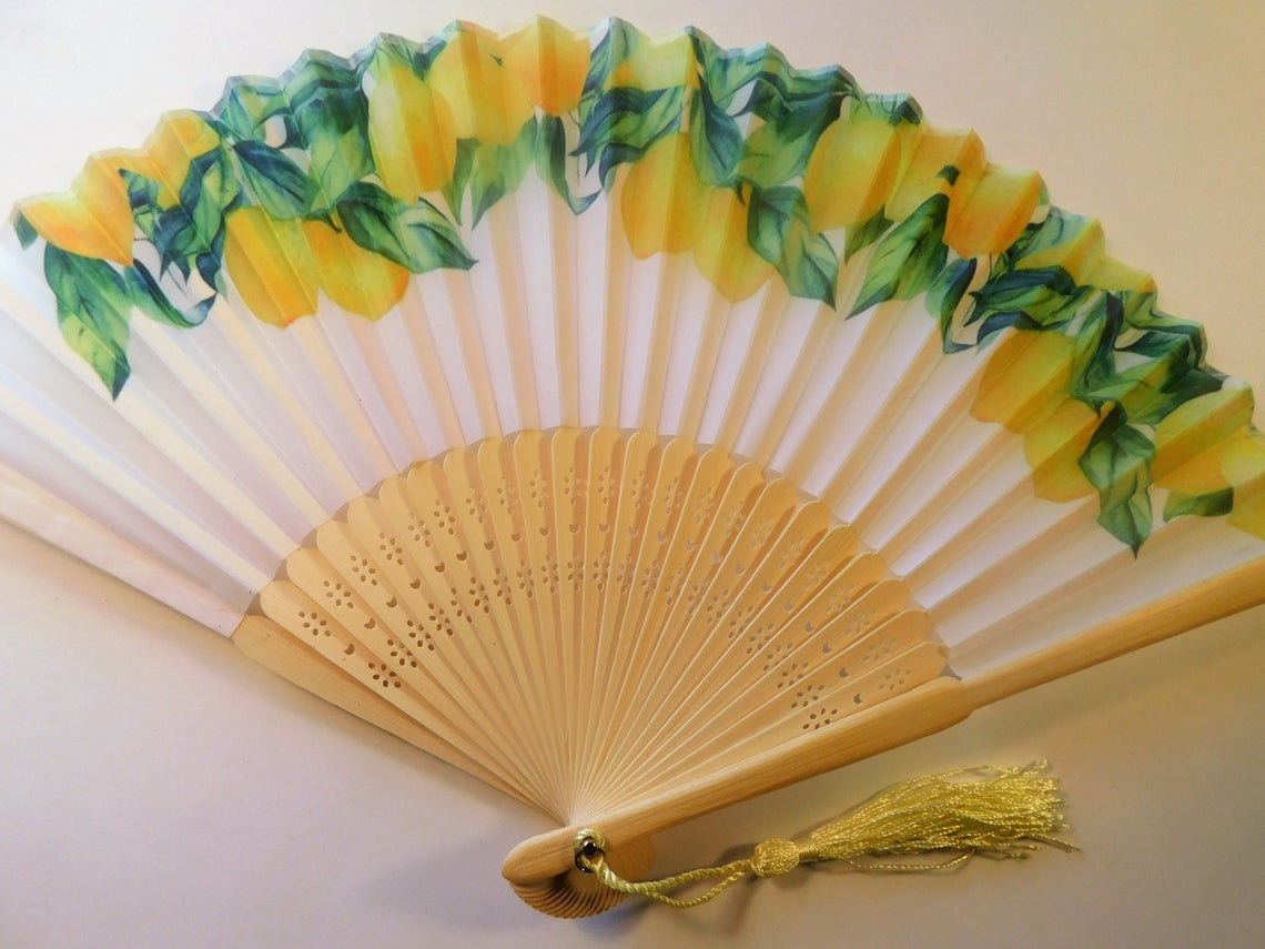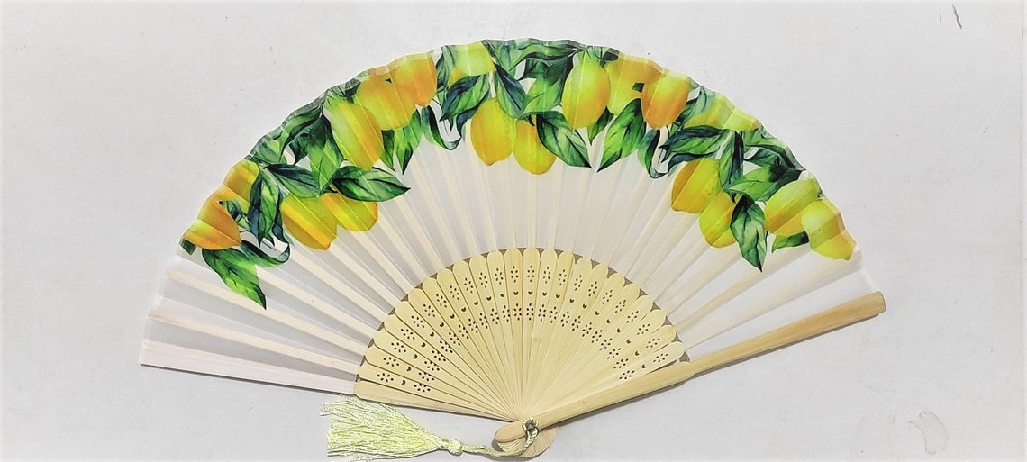 This lemons fruit silk nylon fanhas a white background along with silver trim along the top edge of fan. Natural Bamboo ribs. Comes with a colorful Tassel made of fabric. This fan Measures are 8.5 " x 15". When opened. The Fan gives good luck along with a Beautiful Lemon Fruit Floral Scene.