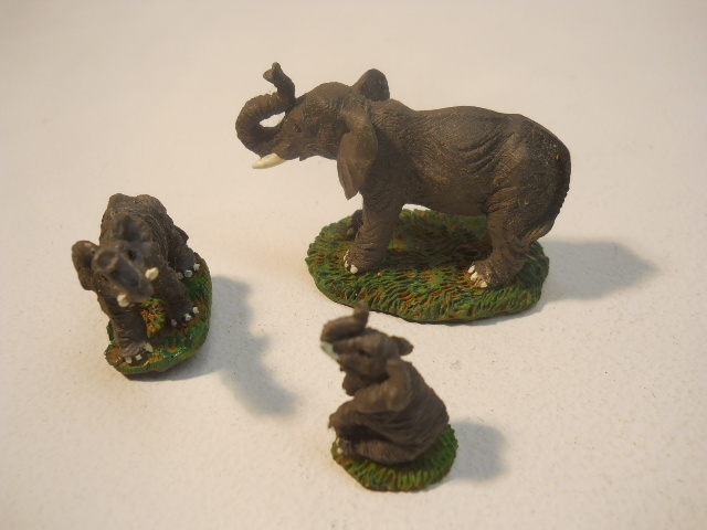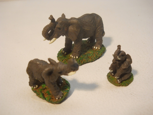 This Beautiful vintage detailed Elephants are painted on heavy polyresin. Figure Measures upto 2.5" High. Has white toe nails and walking on grassy ground. Each elephant is in a different pose. A real nice collectible set.