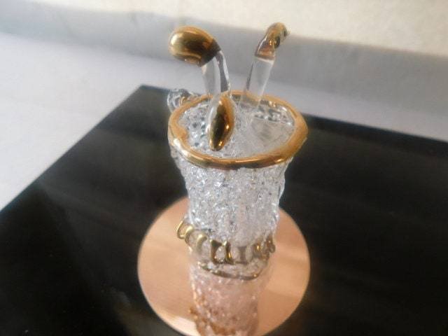 This is a Blown Glass Golf Clubs and comes with a Mirror. This appx Measures 4.0"H. Glass clear with gold with Beveled edge Mirror. Mirror has slate bottom. Beautiful Art Glass Decorative. New Vintage