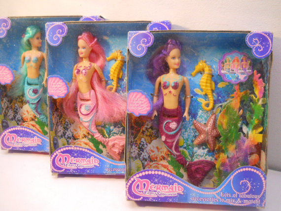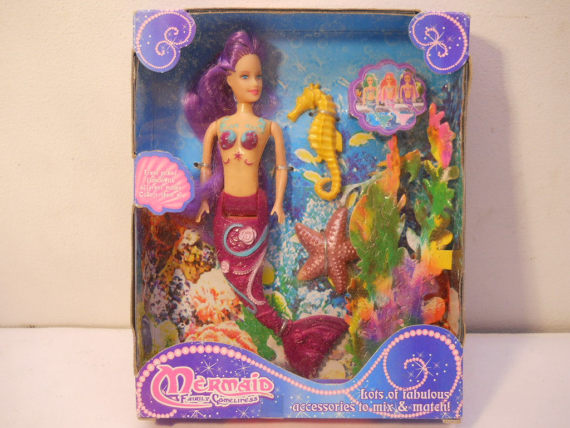Mermaid Doll Has adj joints. Comes with Accessories. The Mermaid is appx 5"Tall, and comes with a bow in her hair. Comes in 3 different colors, Blue, Purple and Pink. The set is hard plastic and comes blister packed w/window box. choose color