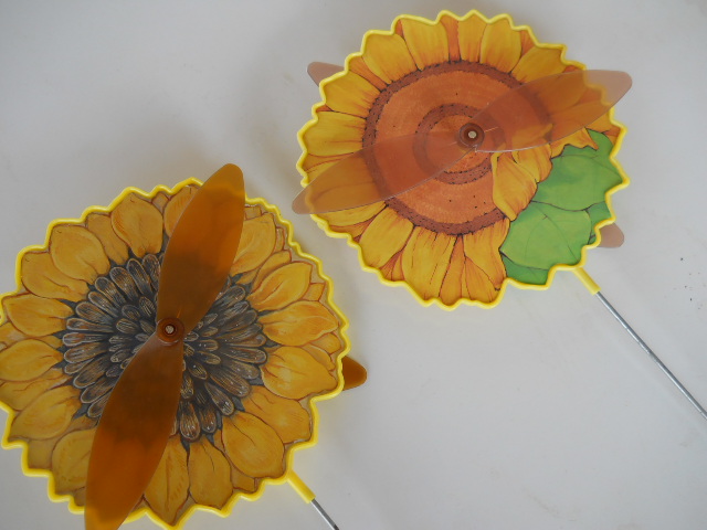 Beautiful Sunflower wind spinner with metal rod. Has double sided flower with doubled spinners. The Sunflowers measures about 10" Round/diameter and 21" metal rod. Made of Plastics & Metal. Vintage