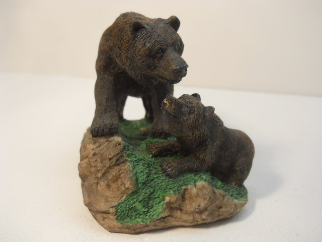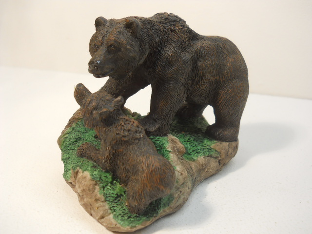 Wild Grizzly Bear with Cubs. Hand Painted on heavy poly resin material. The figurine measures 5"H. x 4"W. x 4.5"L. Has layered rock with grass decor.. Delicately painted by a artist. Shows real nice true colors. This is a very nice piece