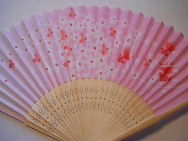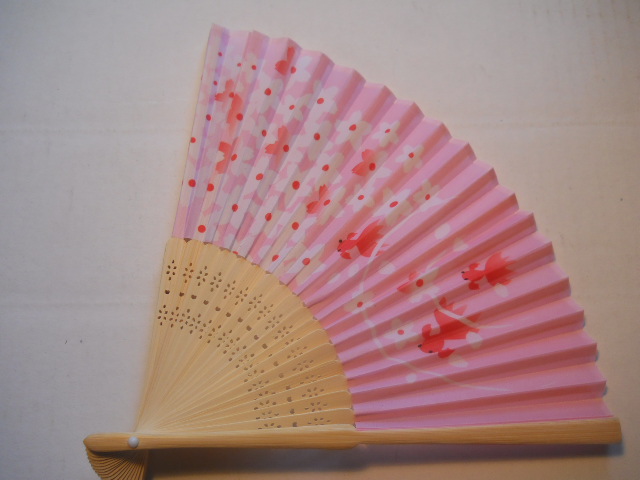 This Fan is hand made on genuine silk and bamboo. This is beautiful designed on Pink and floral flowers along with fish, Beautiful design. The Measurements are 8.5 " x 15". When opened. The Fan gives good luck along with Oriental Culture.