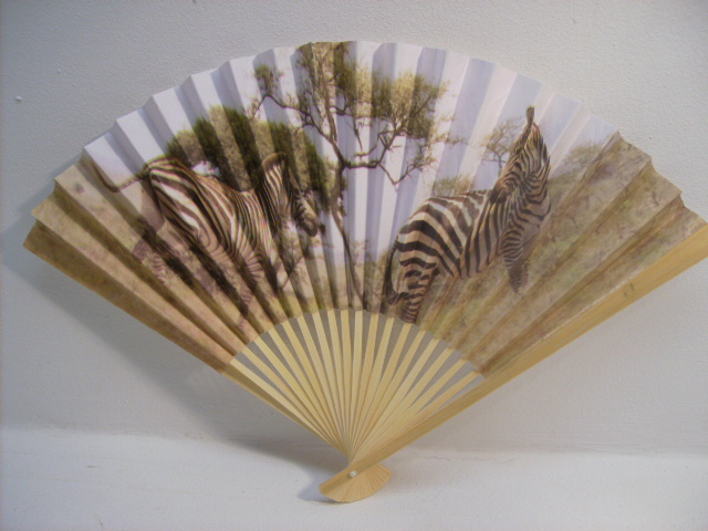 This fan has Zebra Animal Safari scene . The measurements are 11 x 16 inches When opened. Come as shown. Safari wildlife animal printed fan. Made of heavy paper and comes with wooden fan bars Very nice Vintage condition