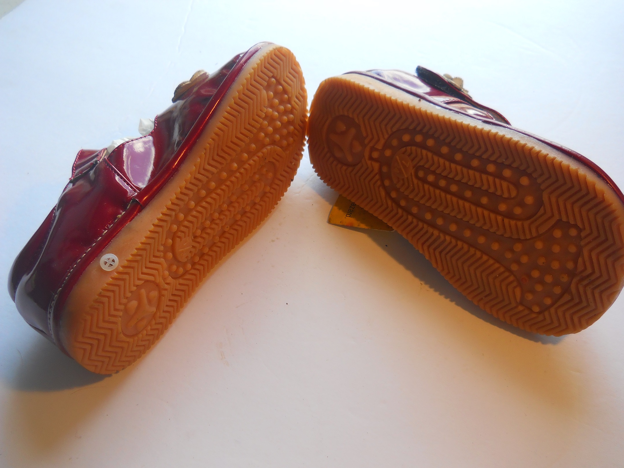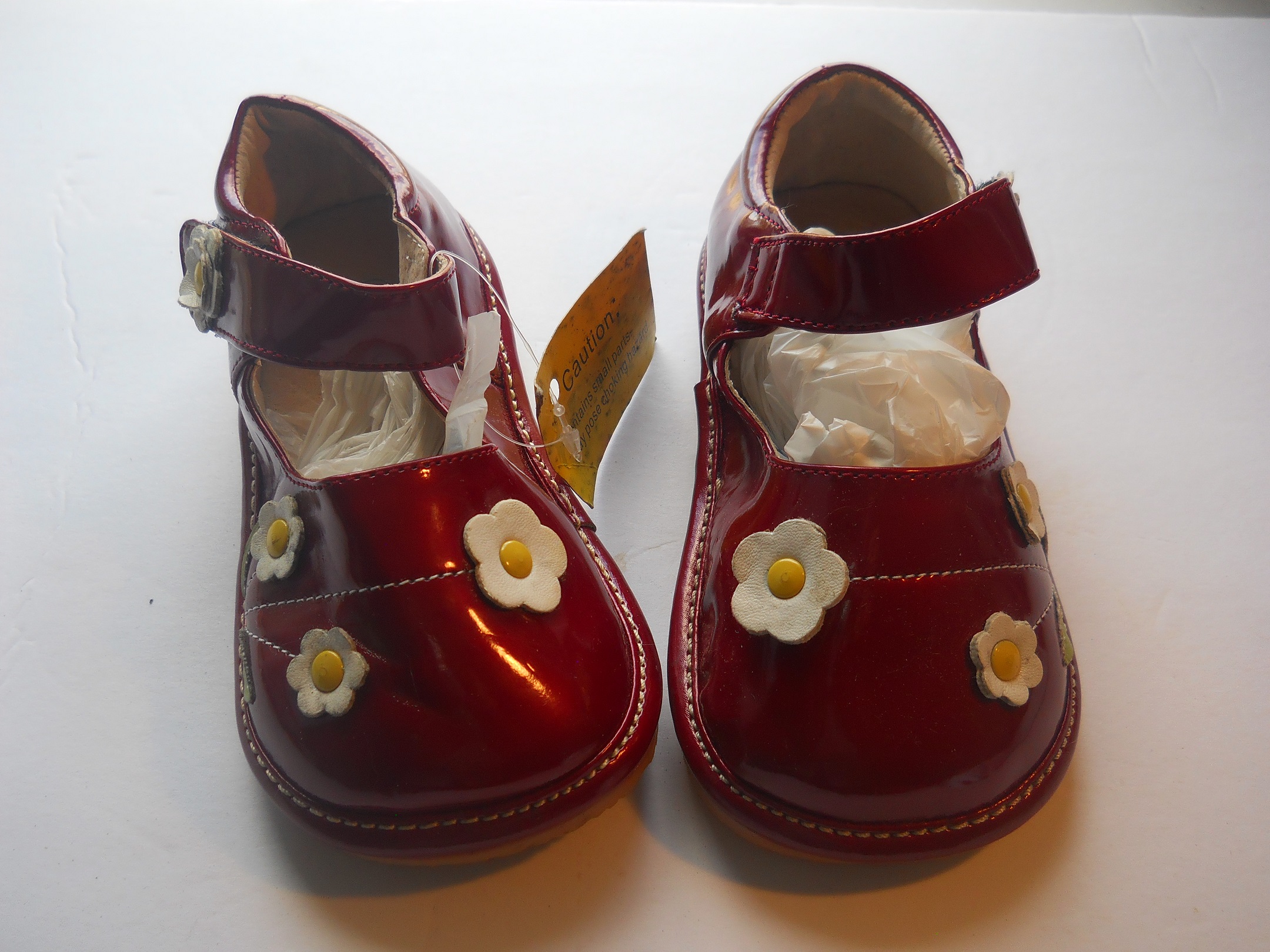 These are Tommy kids shoes with hoop and loop strap. Red leather and have white flowers. There very glossy shinny, New with side tag