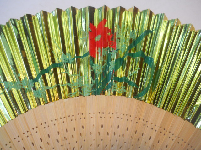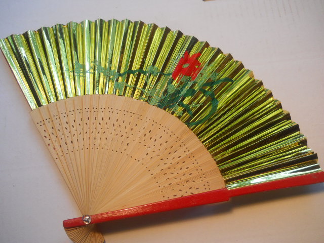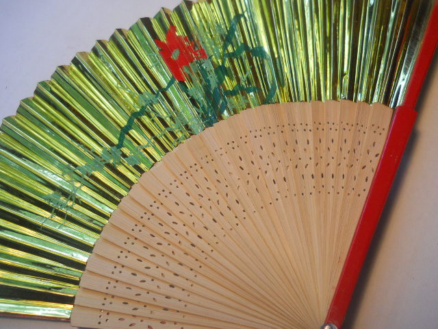 Fan has Multiple Painted colors among the floral. The Measurements are 9.5" x 16". When opened. This is a beautiful floral metallic shinny painted material on Gold. Wood is carved Bamboo. Quality painting in Multiple flower designs. Fan is hand painted. Vintage