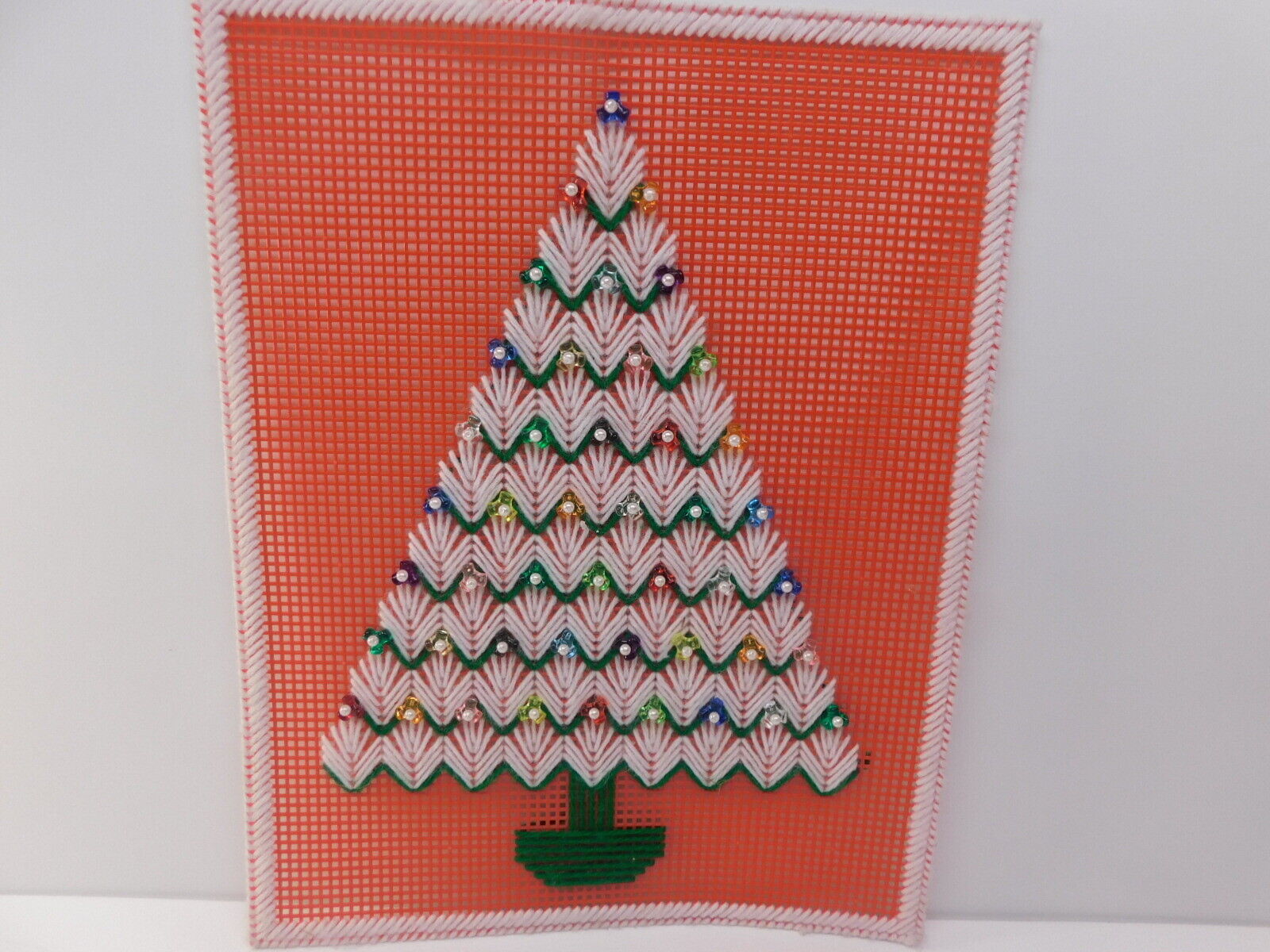 This is a handmade Christmas tree with Pin Pearls and plastics. has Been decorated with Embroidered yarn. Wall Hanging with loop hole on top. This measures 11 x 14 inches D. plastic back mat