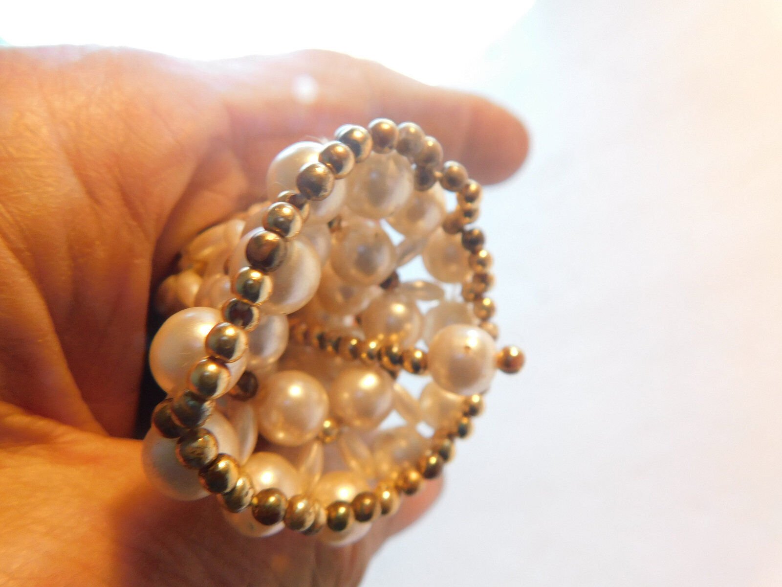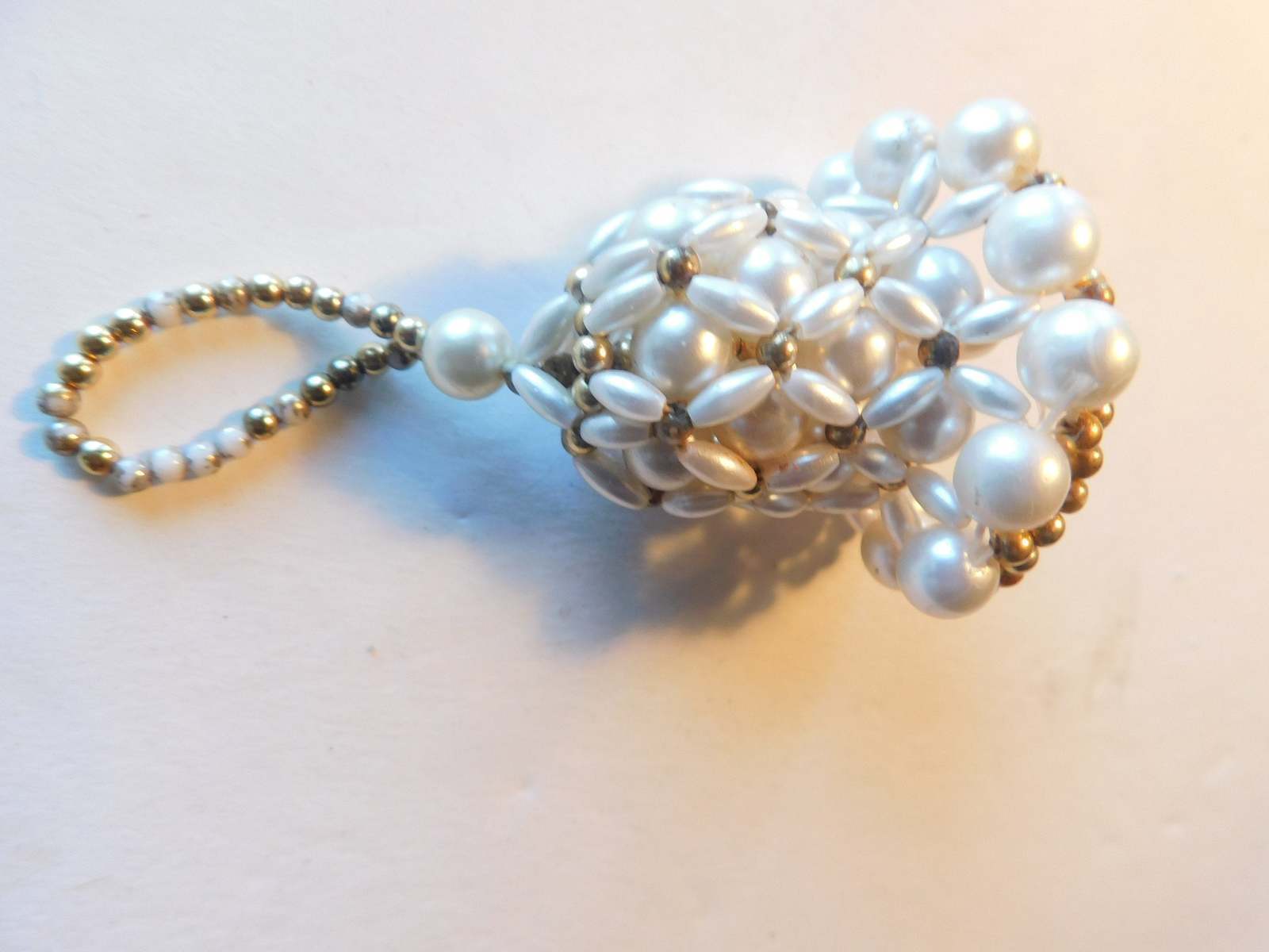 Thisis a hand made peals decor bell ornament. This has a pearl bell on gold bead chain in the center. all attached together to make this wonderful and pretty Christmas bell ornament. This measures 3.5 inches high x 2.0 inches. only 1 avail. All hand done.