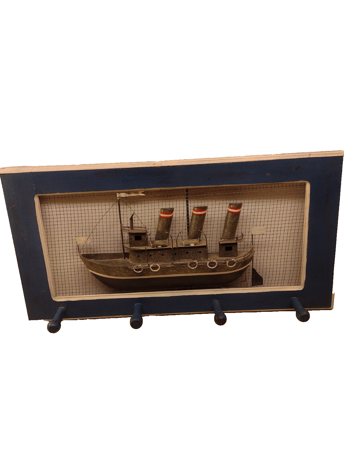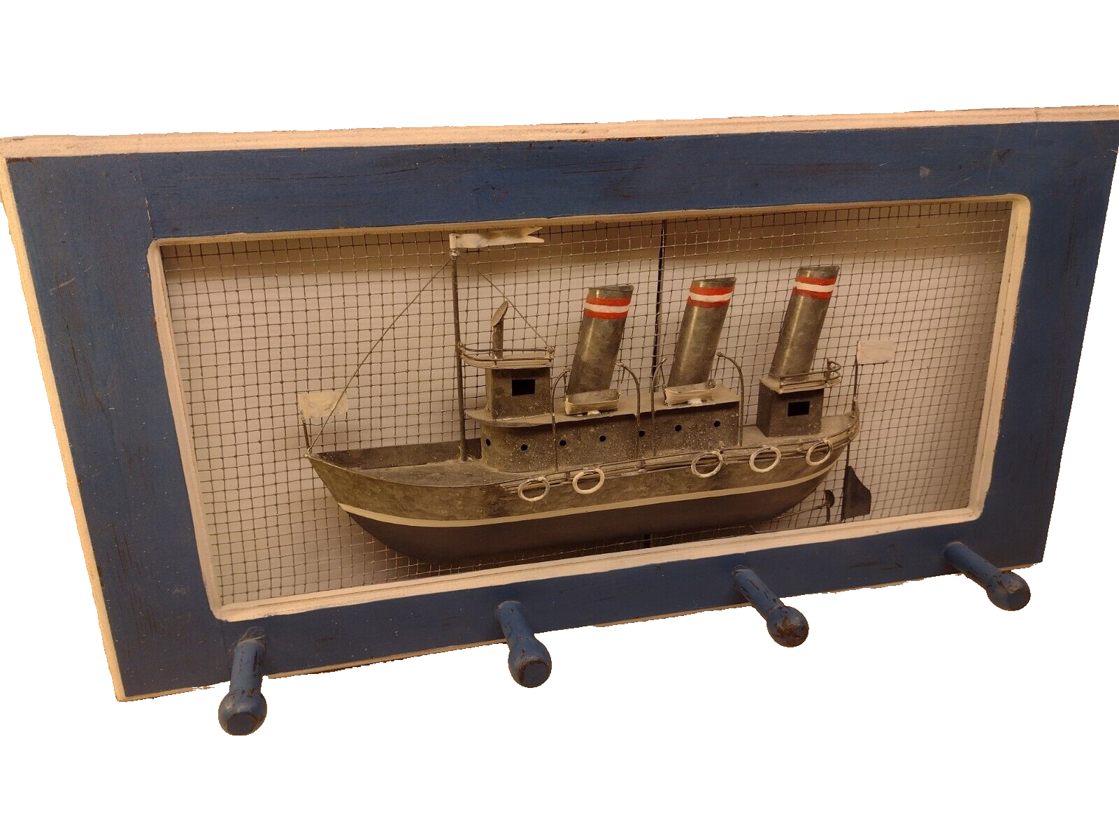 Handmade Wood / Metal Ship w/ Coat Hangers Pegs Boat Picture Plaque