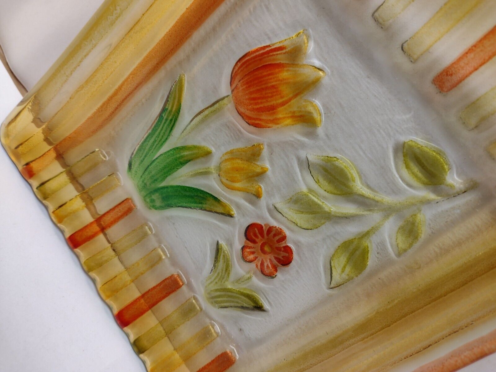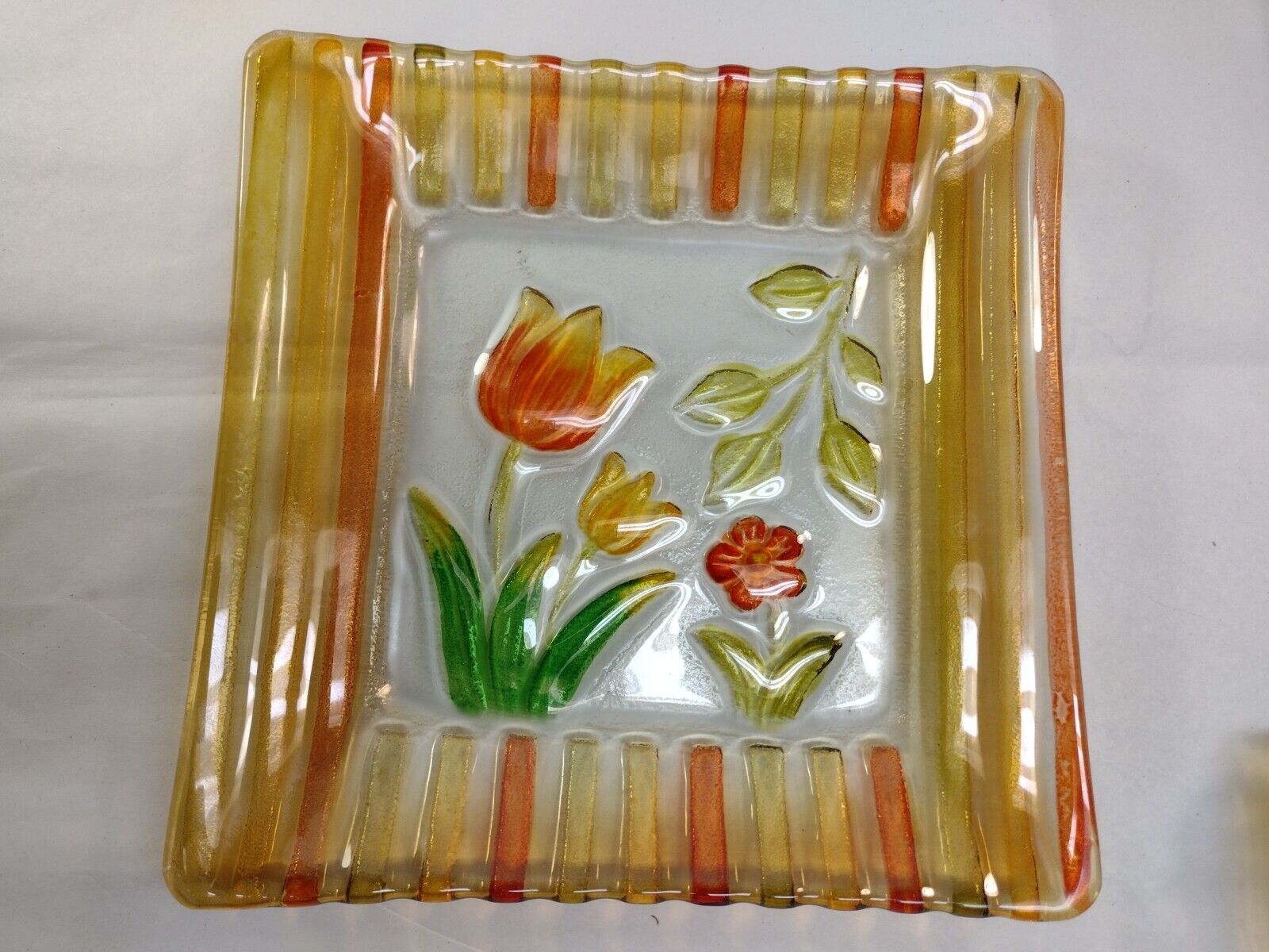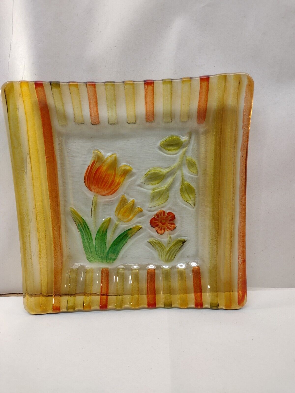 This is a Preowned Fused Art Glass Hand painted Tulips Floral Plate by Ganz and is in excellent condition.. measures 8 x 8 x 1" Square. Has a slant inward edges on the sides, great decorative plates.