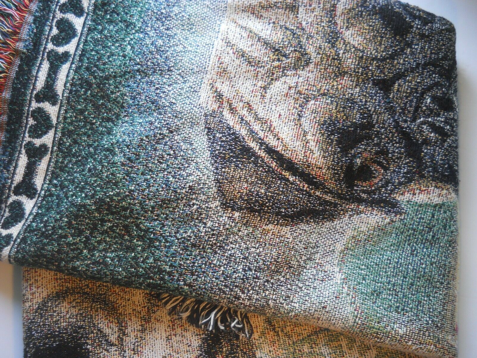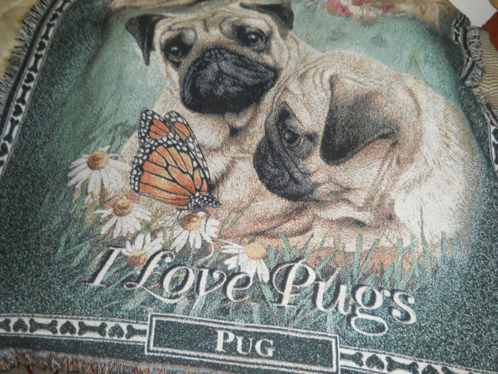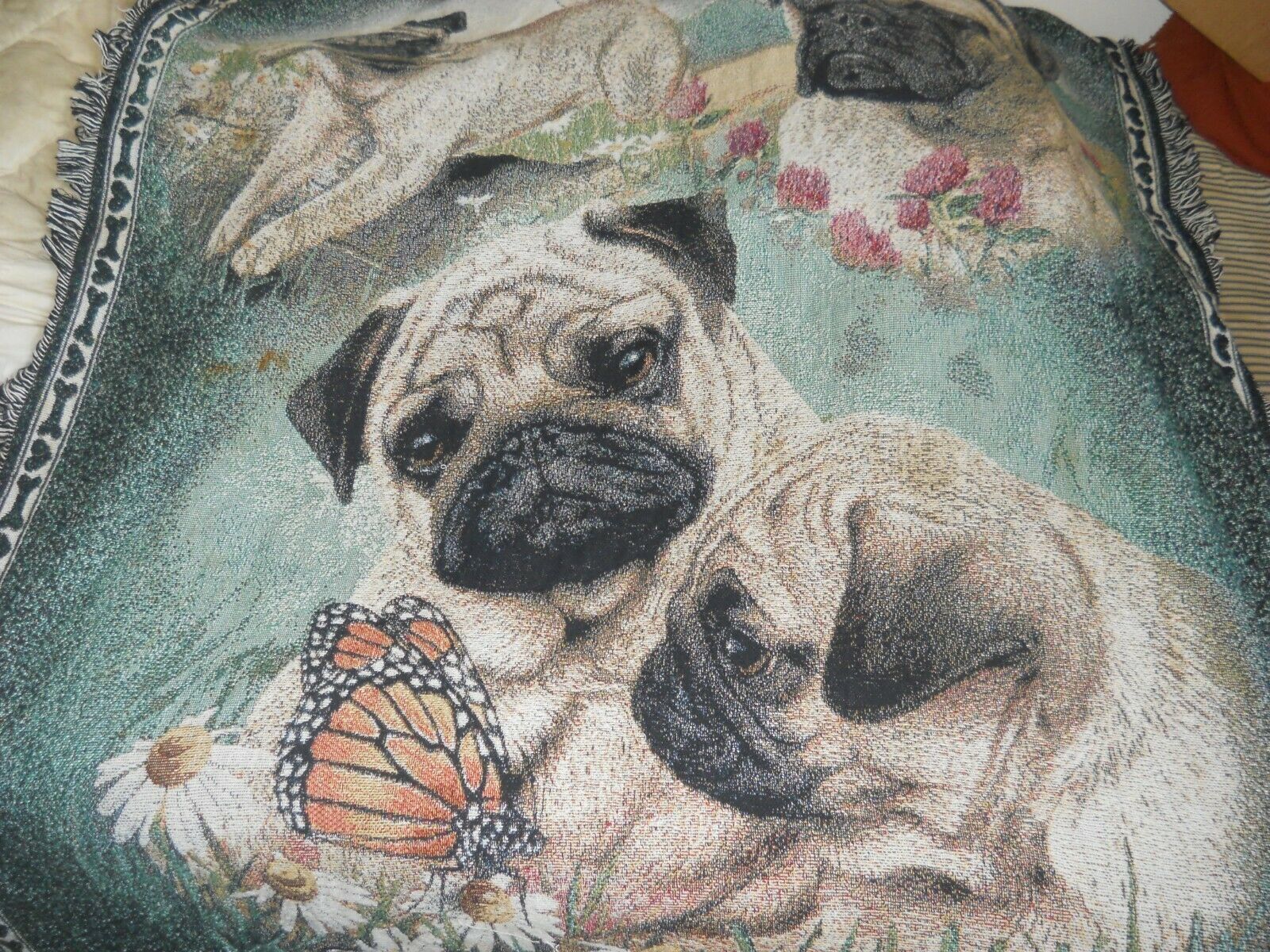 This is a Beautiful Tapestry Blanket or Throw with Pug all over it. That measures 75 x 56 square. All hand made. Has multiple colors with lace. polyester materials. No rug mat on backing so this is a throw can be a rug for the den. Pre-owned. in A+ Condition
