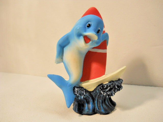 This Whimsical Character Dolphin has beach board in hand. Standing in a wave of water. The dolphin measure appx 4.5"H. Finished and painted by hand. Made of durable polyresin. A very nice painted dolphin.